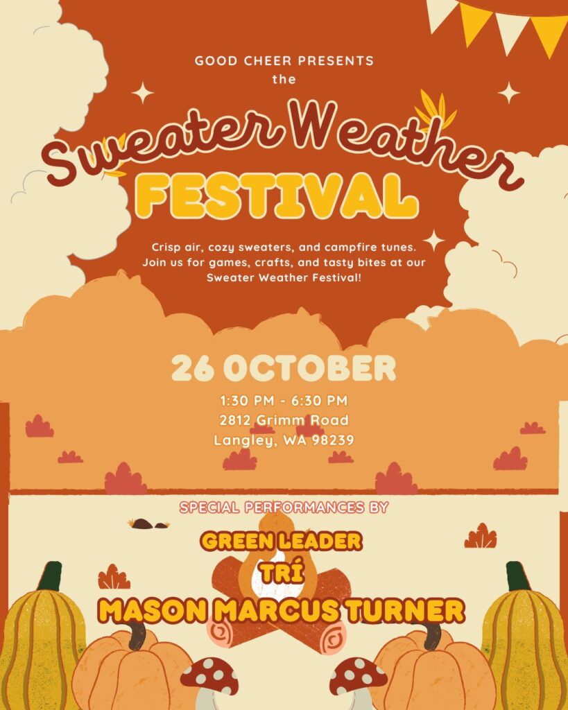 Good Cheer Food Bank and Thrift presents the Sweater Weather Festival, this Sunday October 26, 2025. This year’s location is 2812 Grimm Road, Langley, WA. Festivities begin at 1:30pm and wrap up at 6:30pm.