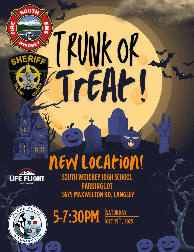 This Saturday October 25, 2025 from 5 to 7:30pm join the Trunk or Treating at a new location at South Whidbey High School parking lot.